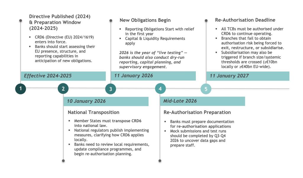 The EU’s new Capital Requirements Directive (CRD6 / Directive (EU) 2024/1619) harmonises rules for third-country banks in the EU. From 11 January 2027, foreign banks can no longer provide core banking services cross-border; they must operate through an authorised EU branch or subsidiary.